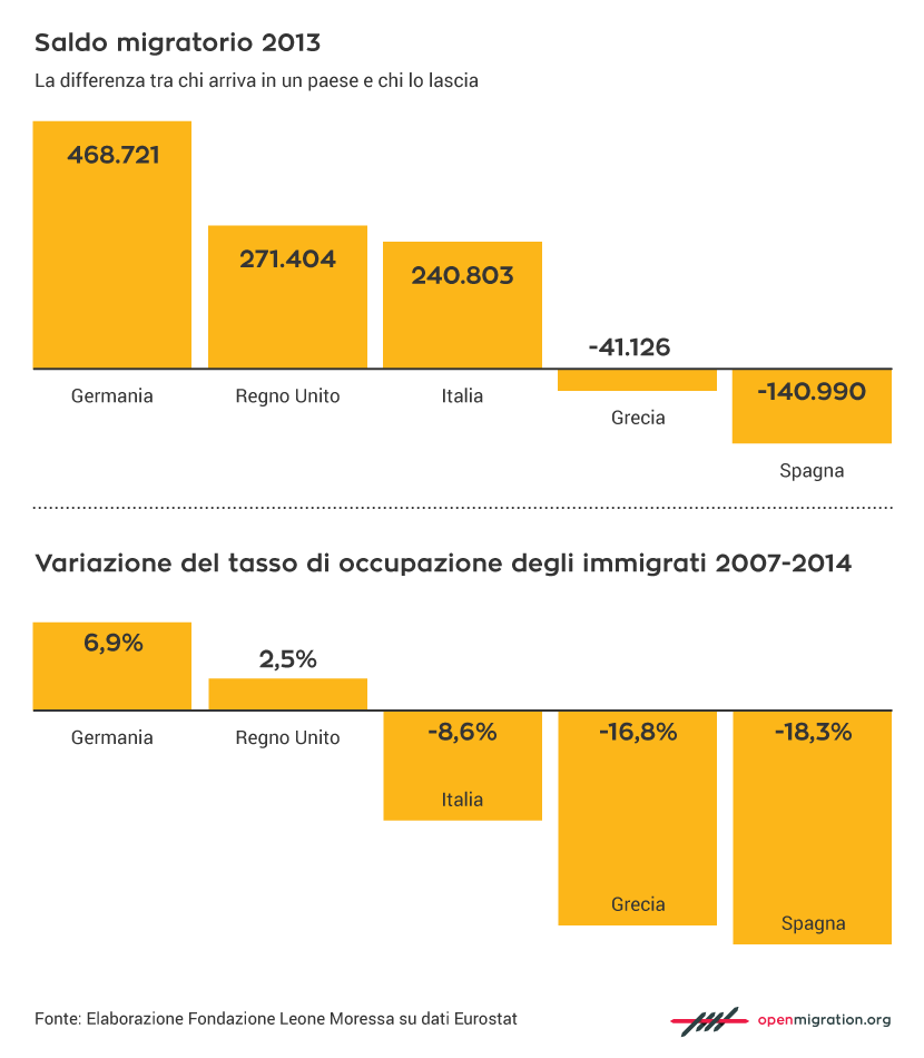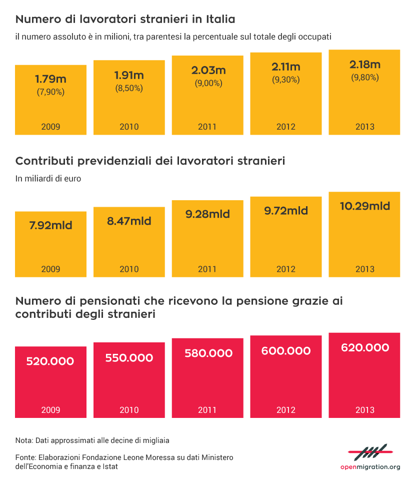 Из примерно 5 миллионов иностранных резидентов около 3,46 миллиона являются налогоплательщиками. Только за один год они задекларировали налогооблагаемый доход на сумму 45,5 миллиарда евро и уплатили около 6,8 миллиарда евро подоходного налога Irpef. Кроме того, они перечисляют миллиарды евро в виде социальных взносов.