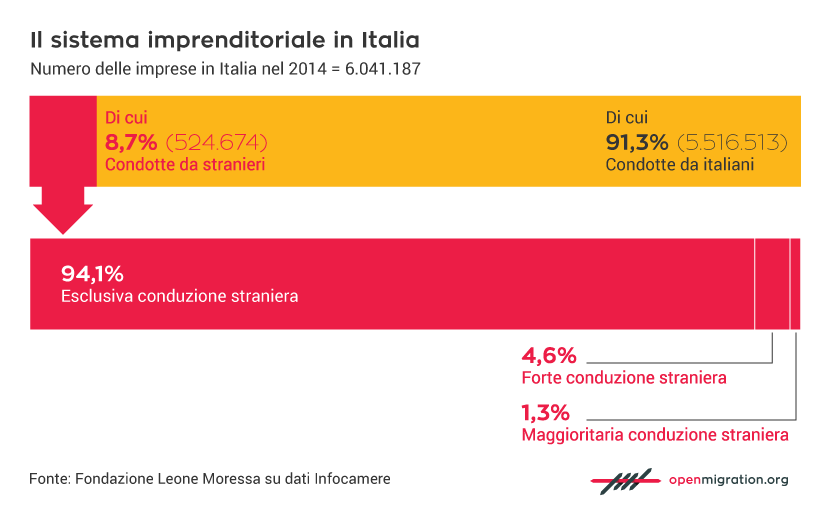 Не менее важен и вклад иностранцев в предпринимательство. В Италии действует более 500 тысяч предприятий, возглавляемых иностранцами, и их число за последние годы растет. В то время как количество итальянских предпринимателей сократилось почти на 7% за пятилетний период, число иностранных предпринимателей увеличилось более чем на 20%.