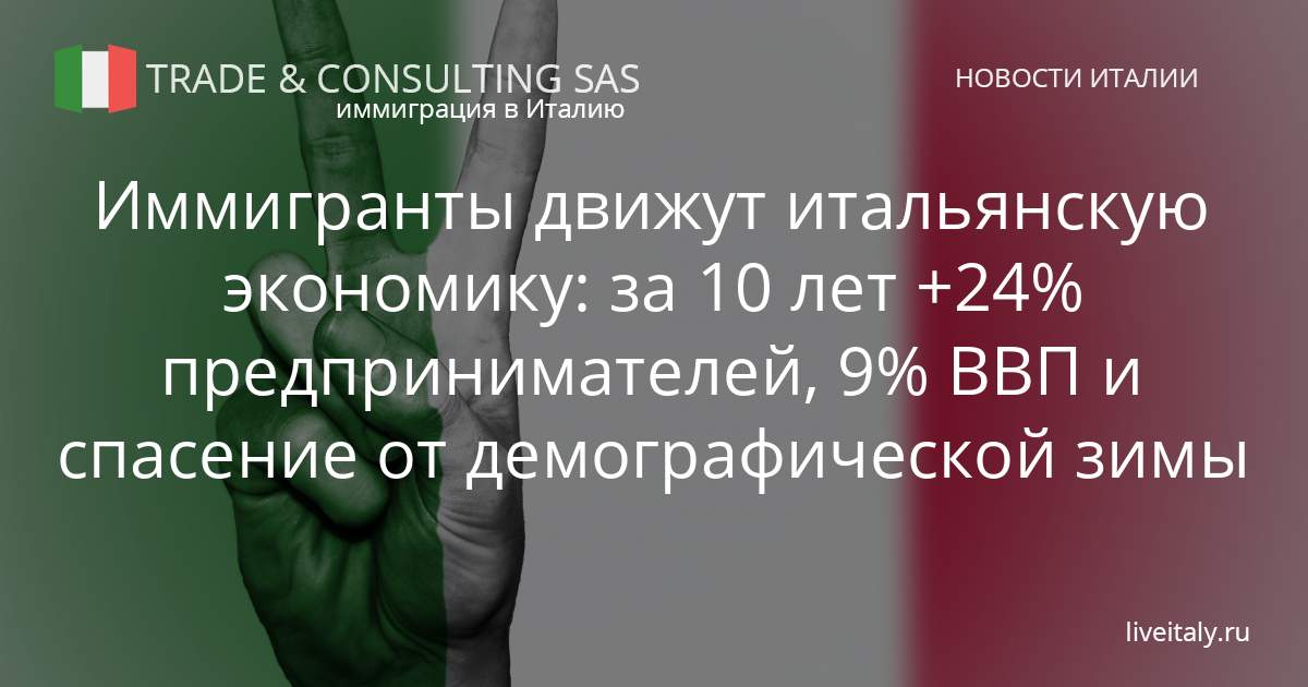 За десятилетие (2014–2024) число предпринимателей-иммигрантов выросло на 24%, в то время как среди граждан Италии этот показатель сократился более чем на 5%. Сегодня иностранцы вносят 9% в ВВП страны, с особенно высоким вкладом в сельское хозяйство (18%) и строительство (16,4%).
