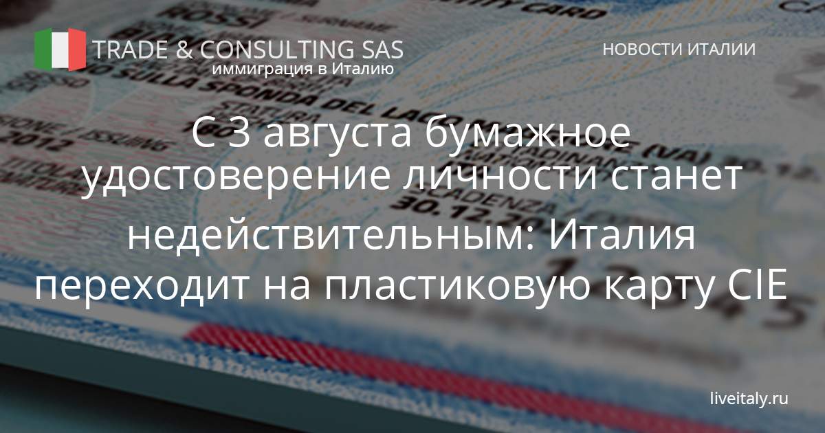 С 3 августа бумажное удостоверение личности окончательно утратит силу и будет заменено электронным документом CIE. Даже если бумажный документ формально остается действительным, с указанной даты он больше не будет признаваться, ни за границей, ни в Италии.